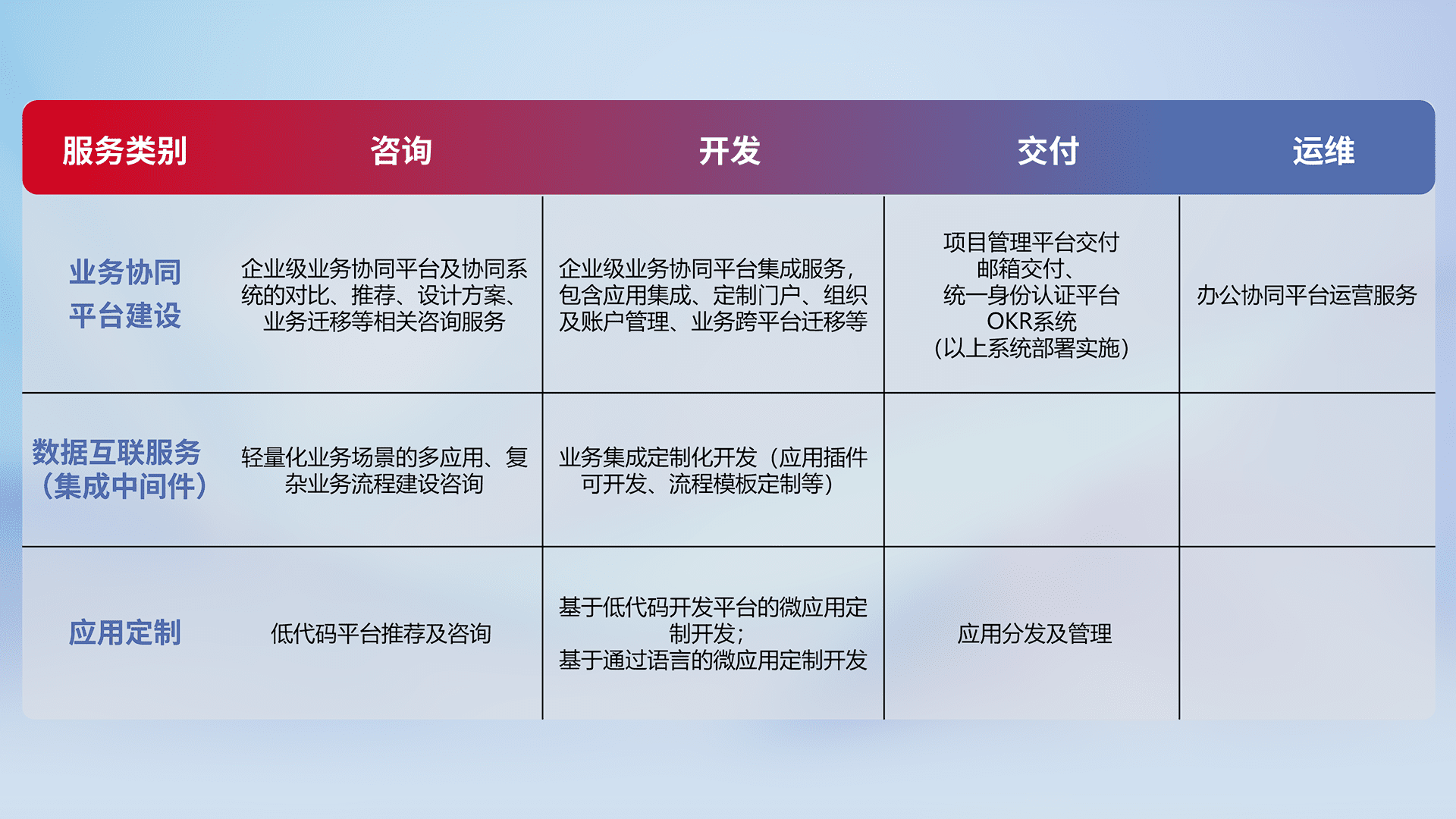 针对钉钉、、企微、、、、IDaas等平台级产品提供产品的规划、、、、方案、、、交付、、、定制化开发等服务,,,实现如统一协同办公、、、、智能客户服务、、、混合会议管理、、、智能数据查询、、、等业务场景,,,实现数字化转型。。。。